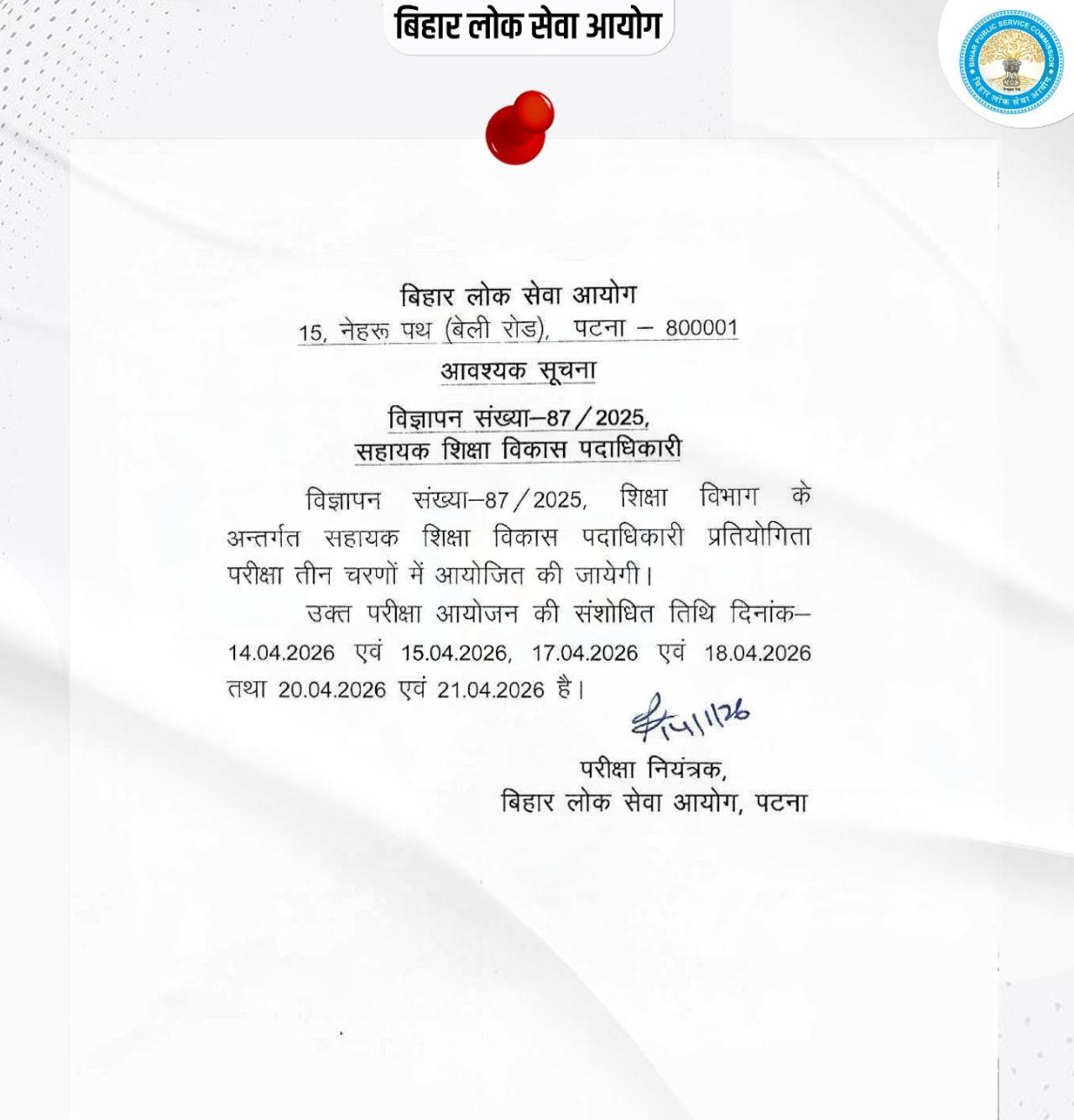 The BPSC AEDO Exam 2026 will be conducted on 14, 15, 17, 18, 20, and 21 April 2026. Candidates can check their exam city and admit card using their Registration Number, Enrollment Number, or Date of Birth.